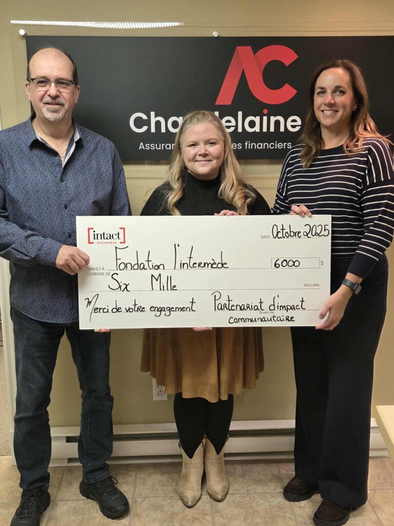 Sur la photo: Monsieur Marc Ayotte, président de la Fondation l’Intermède, Madame Pascale Donnon, directrice de comptes au développement des affaires de Intact Assurance, et Madame Carine Chapdelaine directrice en assurances de particuliers chez Chapdelaine assurances et services financiers.